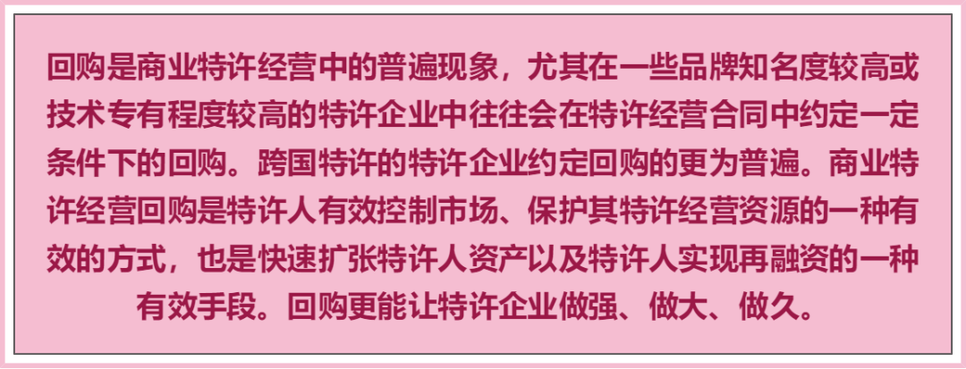 4、功能性。商业特许经营回购不仅是特许人快速做大、做强的有效途径,具有很强的战略性;也可以作为特许人帮助被特许人,盘活被特许人资产、促进被特许人经营的有效手段。